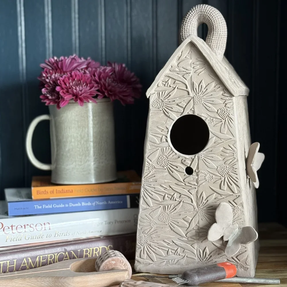 In this 2 day workshop guests will be constructing a birdhouse from clay slabs. During the first class we’ll be designing and building our houses with texture and patterns to create sweet little details on this three dimensional tiny home. This is an instructed build, and meant for a real bird to nest in. We will have a list of local birds to talk about, and dimensions that specific birds look for to build their homes and feel comfortable.