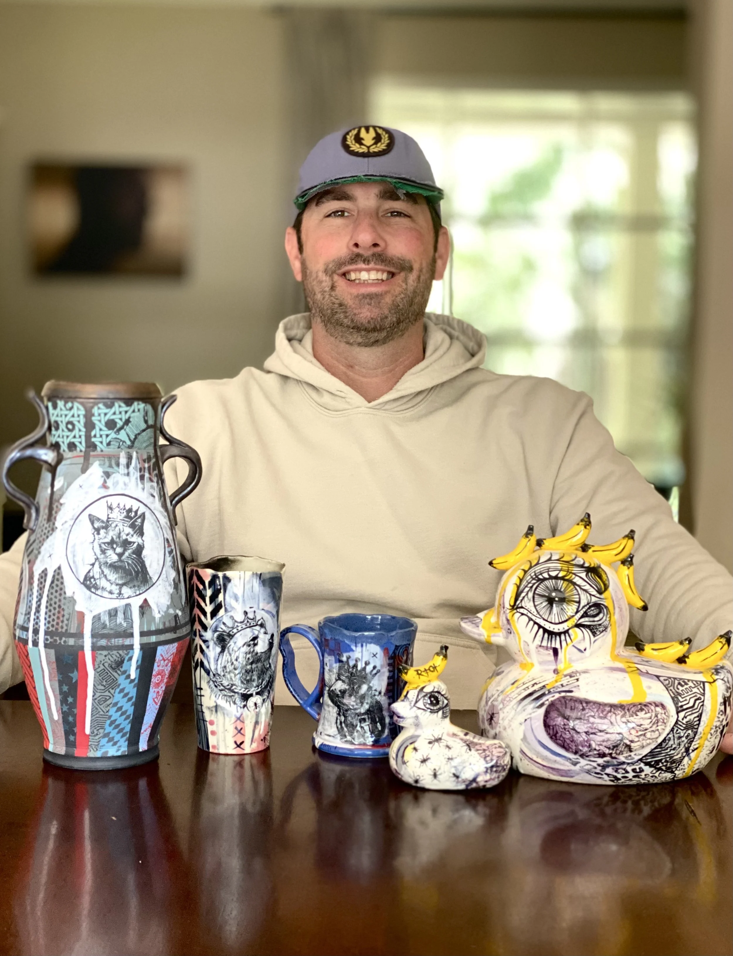 Tony Young graduated from Bowling Green State University and works from his home studio in Ohio. His underglaze work is graffiti inspired with symbolic imagery plastered on every surface. He is a High School art teacher currently in his 19th year. He loves teaching art and especially has a passion for ceramics. Tony’s work has been accepted into more than 25 exhibitions including a feature at Charlie Cummings Gallery and published in Ceramics Monthly.